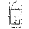 Narzucamy 63 oczka na druty nr 2 1/2 i przerabiamy ściągaczem l cm na wysokość. Zmieniamy druty na nr 3 i robimy dalej pończoszniczym w pasy. Na wysokości 11 cm ujmujemy od prawego brzegu co 2 1/2 om 6 razy po l oczku. Na wysokości 14 i pół cm wyrabiamy kieszeń. W tym celu pozostawiamy na agrafce 15 oczek od prawego brzegu i 17 oczek od lewego brzegu. Na pozostałych 29 oczkach przerabiamy drutami nr 2 1/2 ściągaczem 6 rzędów i oczka te zakańczamy. Narzucamy teraz 29 oczek na druty nr 3 i przerabiamy kolorem miodowym, ściegiem pończoszniczym 11 cm na wysokość (na spód kieszeni). Podejmujemy teraz oczka pozostawione w oczekiwaniu, umieszczając w środku znajdujące się na drucie 29 oczek, przerabiamy dalej do wysokości 30 cm, po czym dodajemy od prawego brzegu do 2 i 3/4 cm 6 razy po l oczku. Na wysokości 47 cm zakańczamy, na podkrój pachy, co drugi rząd od prawego brzegu: l raz 4 oczka, l raz 3 oczka, 2 razy po 2 oczka, 4 razy po l oczku. Jednocześnie od lewego brzegu zakańczamy na podkrój dekoltu: 15 razy po l oczku co 4 rząd, 3 razy po l oczku co 6 rząd. Na wysokości 67 cm zakańczamy w 6 razach oczka na ramię. Prawy przód przerabiamy podług tych samych obliczeń.