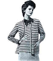 Komplet składa się z klasycznego blezera i długiego pulowera bez rękawów w trójbarwne pasy oraz z jednobarwnej spódnicy w kolorze jednego z pasów. Kolory: miodowy, brązowy oraz biały.