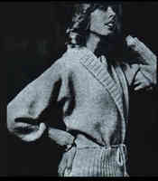zszywamy szwy, góry rękawów oraz ramion. Nabieramy 38 oczek ma druty nr 3 na lewej połowie pleców oraz 114 oczek lewego przodu pozostawionych w oczekiwaniu i te 144 oczka przerabiamy ściągaczem 2/2 następująco: przerabiamy najpierw l rząd ściągaczem 2/2, a potem przerabiamy również ściągaczem tylko 54 oczka, odwracamy robotę, przerabiając tylko te oczka, w następnym rzędzie przerabiamy 57 oczek - wracamy, w następnym rzędzie przerabiamy już 60 oczek, wracamy i postępujemy w ten sposób, dodając co drugi rząd 3 oczka więcej aż do wyczerpania wszystkich oczek. Robimy następnie 4 1/2 cm prosto, po czym prawe oczka zakańczamy na prawo, lewe na lewo. Drugą połowę kołnierza przerabiamy podług tych samych obliczeń. Nabieramy teraz u dołu każdej części przodu po 78 oczek, przerabiamy 15 cm ściągaczem 2/2 i wszystkie oczka zakańczamy. Nabieramy 130 oczek u dołu pleców, przerabiamy 15 cm ściągaczem 2/2 rozpoczynając go dwoma oczkami na lewo. U dołu rękawów nabieramy po 56 oczek na druty nr 3, przerabiamy 16 cm ściągaczem 2/2 i zakańczamy wszystkie oczka, jak poprzednio. Zeszywamy dół rękawów oraz boczne szwy. Z 8 nitek robimy sznur ok. 2,5 m długości i przeciągamy go u dołu lizeski tuż nad ściągaczem.